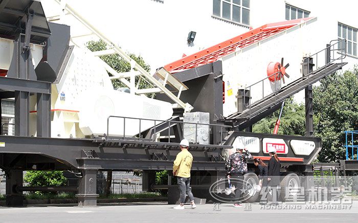 將錘破安裝在輪胎半掛車上那就可以組成一個可隨時移動的破碎機了,再安裝上一個給料機或者篩分機就是一體化的破碎篩分設備了,移動起來很方便,可以直接開到作業(yè)場地,還有遠程操控系統(tǒng),一個人便可操作整條生產(chǎn)線。如下圖所示。